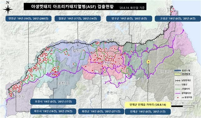 (대한뉴스 한원석 기자)=환경부(장관 조명래)는 강원도 인제군 인제읍 가아리 광역울타리 내에서 발견된 멧돼지 폐사체 1개체에서 아프리카돼지열병(ASF) 바이러스가 8월 14일 검출됐다고 15일 밝혔다.
