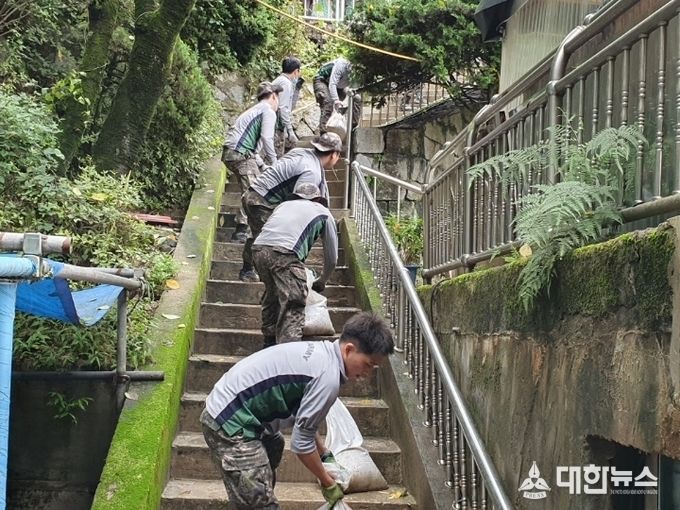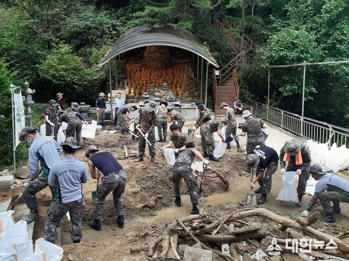 (대한뉴스 김기준 기자)=대전시 보문산 지역 수해복구에 군장병들이 구슬땀을 흘리고 있다.