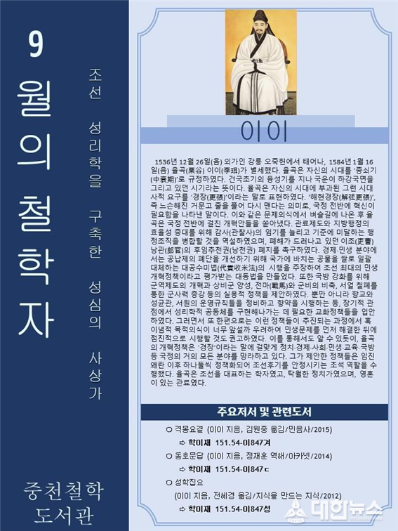 (대한뉴스김기호기자)=중천철학도서관은 조선 성리학을 구축한 ‘율곡 이이’ 선생을 9월의 철학자로 선정했다.