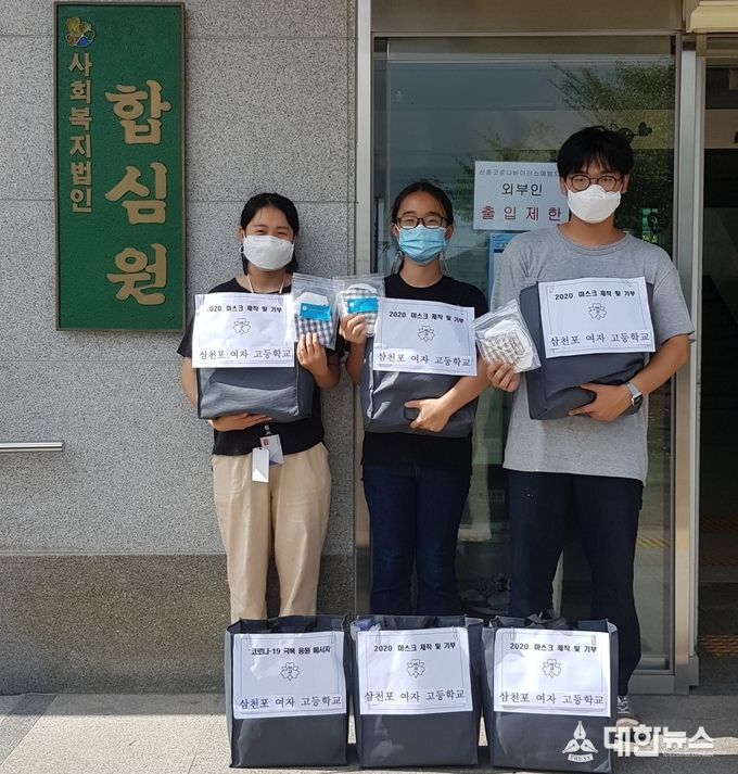 (대한뉴스김기준기자)=삼천포여자고등학교(교장 정창식)는 28일 코로나19로 인해 어려움을 겪고 있는 이웃들에게 도움을 주고자 학교 학생들이 직접 제작한 필터 교체형 천마스크와 응원 메시지가 담긴 엽서를 전달했다.