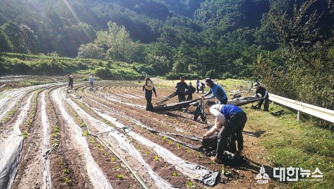(대한뉴스김기준기자)=영양군은 지난 4일 제9호 태풍 마이삭으로 피해를 입은 김모(68)씨, 신모(62)씨 농가 일손 돕기에 구슬땀을 흘렸다.