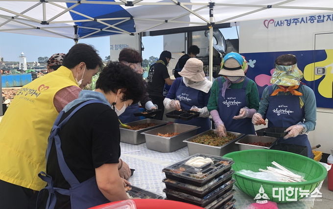 (대한뉴스김기준기자)=(사)경주시종합자원봉사센터 ‘친절한 경자씨(경주의 친절한 자원봉사자)’ 자원봉사자 10여 명은 4일~5일까지, 이번 제9호 태풍 마이삭으로 주택이 침수되는 등 많은 피해를 입은 감포읍 일대 이재민과 자원봉사자 등 180여 명을 대상으로 급식을 나눠 주는 ‘참! 좋은 사랑의 밥차’ 활동을 펼쳤다.