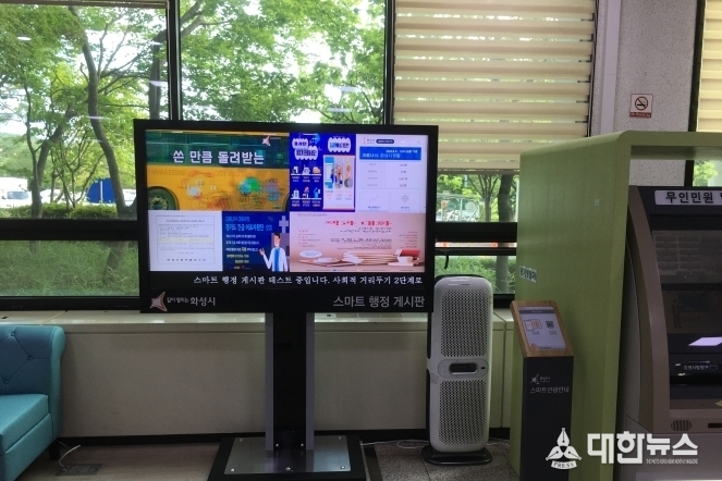 (대한뉴스 한원석 기자)=화성시가 종이 인쇄물을 대체하는 스마트행정게시판을 7일 선보였다. 시는 지난 5월부터 총 2억 3천만 원을 들여 읍면동 행정복지센터 등 35개소에 스마트행정게시판을 설치하고 본격 운영에 들어갔다.