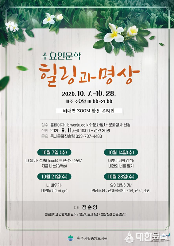 10월에는 정순영 경동대 간호학과 교수의 ‘힐링과 명상’ 강연이 매주 수요일 저녁 7시, 총 4회에 걸쳐 진행된다.