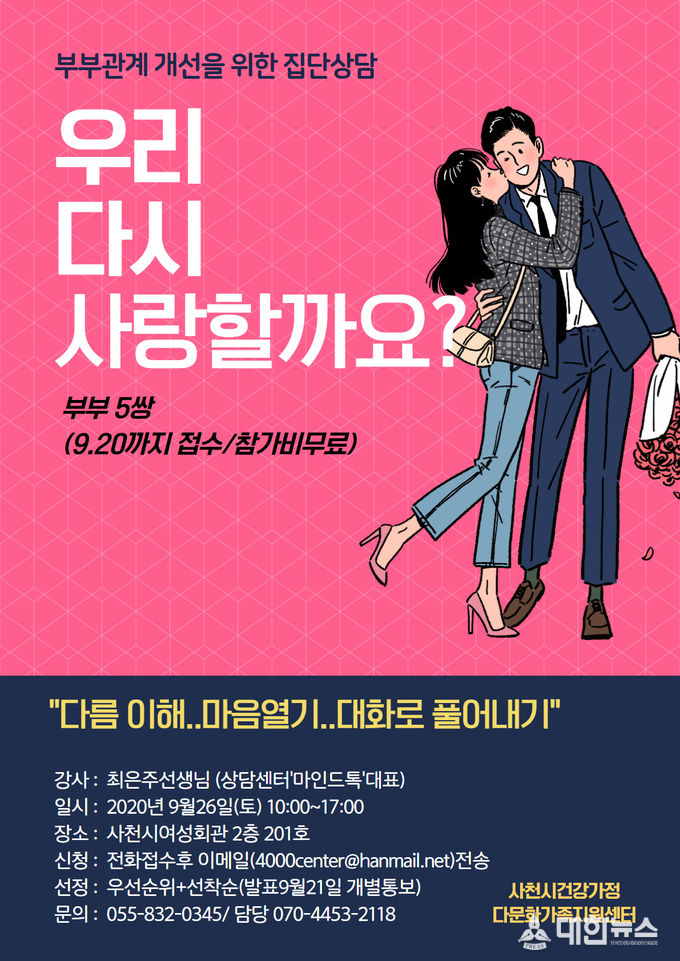 대상은 부부관계 개선을 원하는 20~50대 부부 5쌍이며, 선착순으로 9월 20일까지 모집 중으로 참가비는 무료이다.