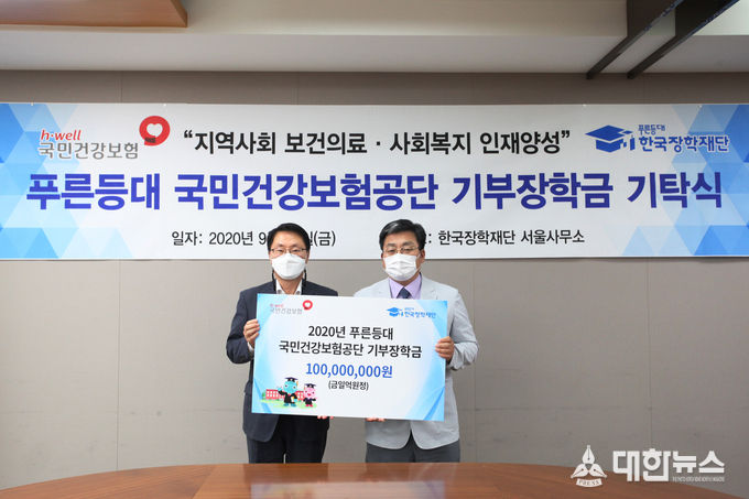 (대한뉴스김기준기자)=한국장학재단(이사장 이정우, 이하 “재단”)과 국민건강보험공단(이사장 김용익)은 9월 11일(금) 한국장학재단 서울사무소 대회의실에서 「푸른등대 국민건강보험공단 기부장학금」 기탁식을 개최했다.