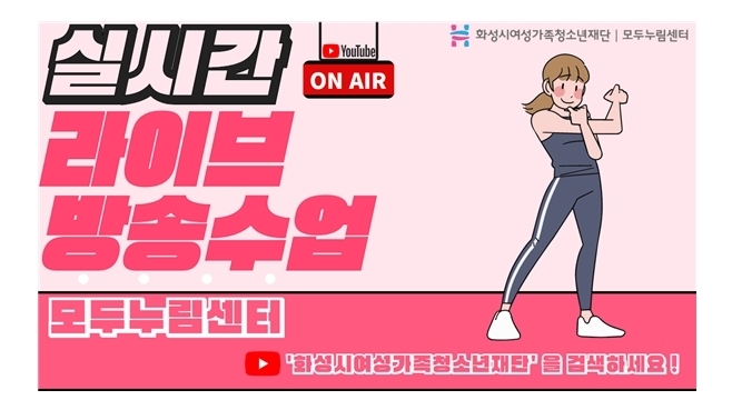 생활스포츠 강의는 9월 넷째 주 월요일인 21일 오전10시부터 화성시여성가족청소년재단 유튜브 채널을 통해 실시간 방송될 예정이다. 모두누림센터 스포츠센터의 생활 체육 프로그램을 경험하고 싶은 누구나 시청가능하다. 주중 평일(월-금)에 같은 시간에 생방송된다. 9월 넷째 주 시범운영을 시작으로 10월부터는 생활스포츠 라이브 강의가 본격적으로 확대 운영될 예정으로, 에어로 댄스, 줌바, 요가 등 다양한 생활스포츠 프로그램으로 시민들을 만날 것이라 예고하였다.