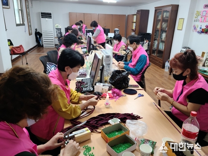 평소에도 남다른 봉사정신으로 활동하고 있는 경산시 경로당 행복도우미들은 바쁜 업무 일정에도 불구하고, 어르신들의 코로나19 확산방지를 위하여 필수적으로 착용하여야할 마스크를 안전하고 위생적으로 상시 착용할 수 있도록 마스크 걸이(끈) 제작에 전원이 5개조로 나누어 참여하였다. 제작과정이 힘들고 어려웠지만 손길 하나마다 정성을 담아 경로당 어르신 한분 한분께 직접 전해드릴 예정이다.
