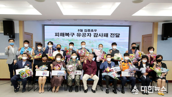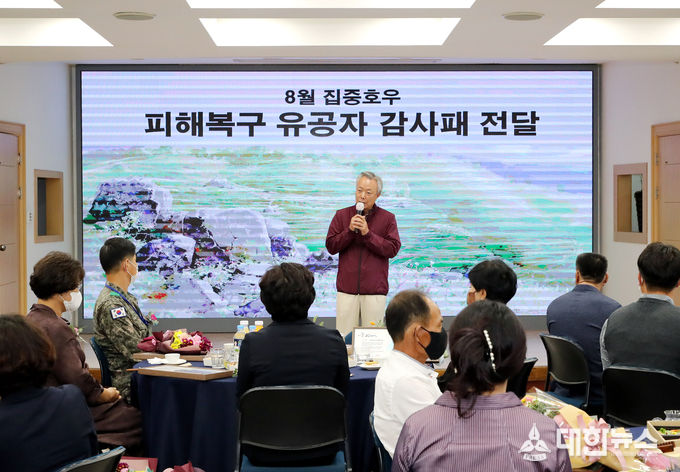 (대한뉴스김기준기자)=하동군은 지난 28일 군청 소회의실에서 집중호우 피해 복구를 위해 가장 먼저 자발적으로 달려와 헌신적으로 봉사해준 군부대·단체·개인 등 25명에게 감사패를 전달했다고 29일 밝혔다.