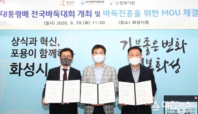 시는 지난 9월29일 시청 접견실에서 (사)대한바둑협회 및 (재)한국기원과 ‘대통령 배 전국 바둑대회’지속 개최 및 바둑진흥을 위한 상호협력에 손을 모았다. 협약식에는 서철모 화성시장을 비롯해 (사)대한바둑협회 윤수로 회장, (재)한국기원 양재호 사무총장, 화성시바둑협회 이상구 회장 등 9명이 참석했다.