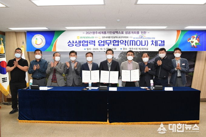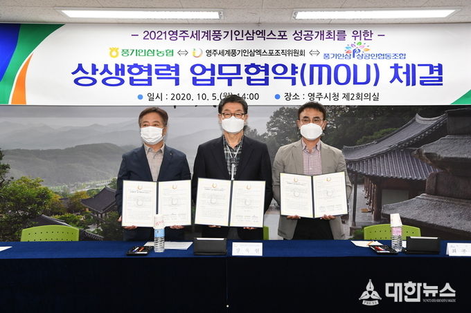(대한뉴스김기준기자)=영주세계풍기인삼엑스포조직위원회(위원장 장욱현)는 지난 5일 ‘2021영주세계풍기인삼엑스포’의 성공개최를 위해 풍기인삼농협(조합장 권헌준), 풍기인삼상공인협동조합(이사장 최종찬)과 상생업무협약(MOU)을 맺었다.