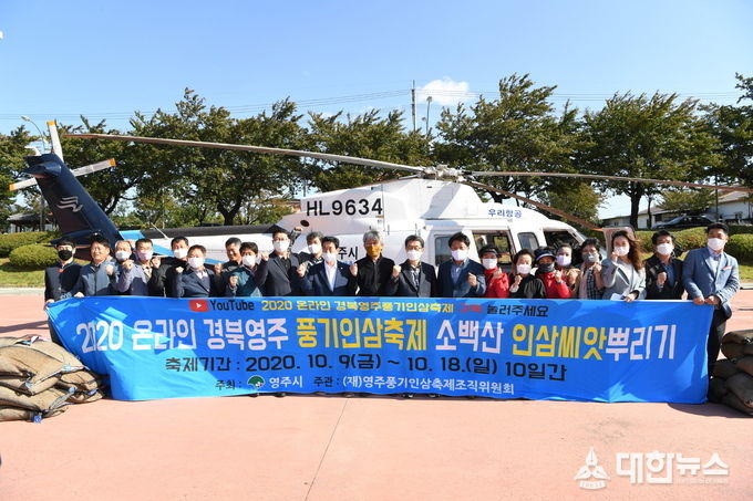 (대한뉴스김기준기자)=영주시는 5일 2020온라인 영주풍기인삼축제’개막 프로그램인 소백산 인삼씨앗 뿌리기 퍼포먼스를 진행했다.