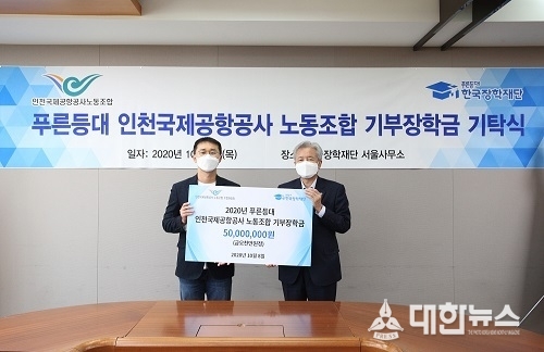 (대한뉴스김기준기자)=한국장학재단(이사장 이정우)과 인천국제공항공사 노동조합(위원장 장기호)은 10월 8일(목) 재단 서울사무소 대회의실에서 푸른등대 인천국제공항공사 노동조합 기부장학금 기탁식을 개최했다.