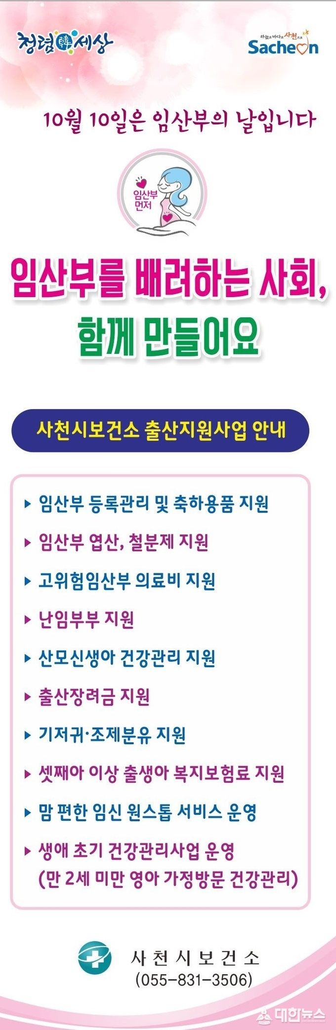 (대한뉴스김기준기자)=사천시 보건소는 「제15회 임산부의 날」을 맞이하여 오는 13일부터 16일까지 사천시청 노을광장에서 관내 보건소 등록 임산부를 대상으로 출산지원 키트 배부 및 홍보관을 운영한다.