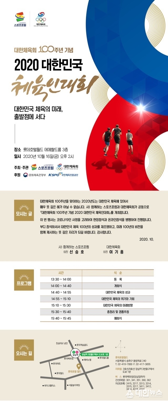 (대한뉴스김기준기자)=대한체육회(회장 이기흥)는 '함께하는 스포츠포럼(회장 신승호)'과 공동으로 10월 16일(금) 오후 2시 롯데호텔월드 3층 에메랄드룸에서 「대한체육회 100주년 기념 2020 대한민국 체육인대회」를 개최하고 대한체육회 유튜브 채널(bit.ly/koctvutube)을 통해 생중계한다.