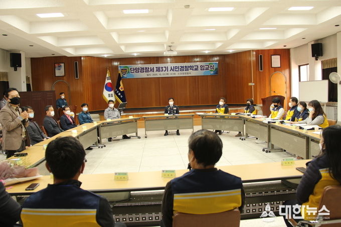 (대한뉴스김기준기자)=단양경찰서(서장 이준배)는 22일(목) 경찰서 3층 대회의실에서 경찰서장, 시민경찰학교 교육생과 졸업생 등 25명이 참석한 가운데 박완복 중앙지구대 1팀장의 축하 섹소폰 연주와 졸업 선배님들의 입교 축하 꽃다발 증정, 교육 및 그간 활동 소감 발표 등 다채로운 행사로 여느 때 와는 다른 화기애애한 분위기에서 제3기 입교식 행사를 개최하였다.