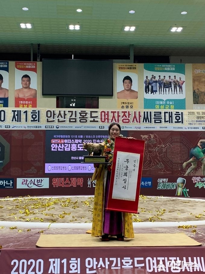 (대한뉴스김기준기자)=올 시즌 ‘무패의 신화’ 이다현선수가 제1회 안산김홍도여자장사씨름대회에서 원년 무궁화장사에 등극하며 시즌4관왕을 차지했다.