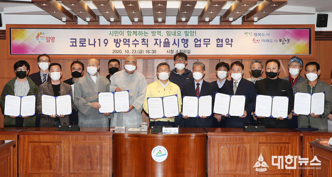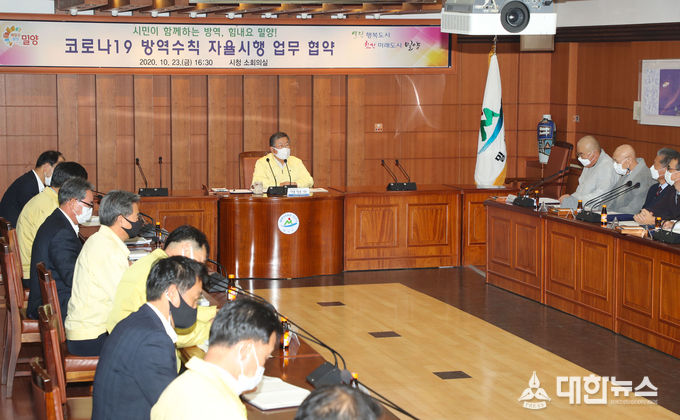 (대한뉴스김기준기자)=밀양시(시장 박일호)는 23일 시청 소회의실에서 고․중위험 다중이용시설 15개 협회(단체)와 코로나19 방역수칙 자율시행을 위한 간담회를 개최하고 상호협약을 맺었다고 전했다.