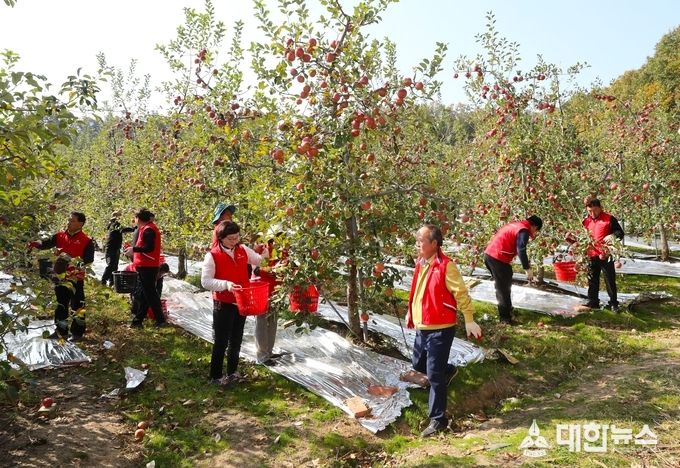 이날 일손돕기는 코로나19 장기화로 심각한 일손부족을 겪고 있는 사과농가의 어려움에 공감하고 농민들의 애타는 마음에 조금이나마 도움이 되고자 사과 수확과 잡초 제거 작업 등을 하며 구슬땀을 흘렸다.