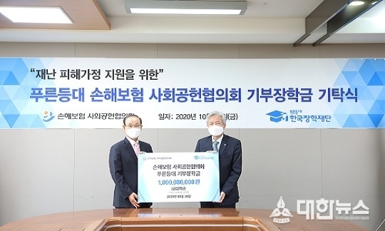 (대한뉴스김기준기자)=한국장학재단(이사장 이정우, 이하 “재단”)은 손해보험 사회공헌협의회(의장 김용덕, 이하 “사회공헌협의회”)와 10월 30일(금) 재단 서울사무소 대회의실에서 푸른등대 손해보험 사회공헌협의회 기부장학금 기탁식을 개최했다.