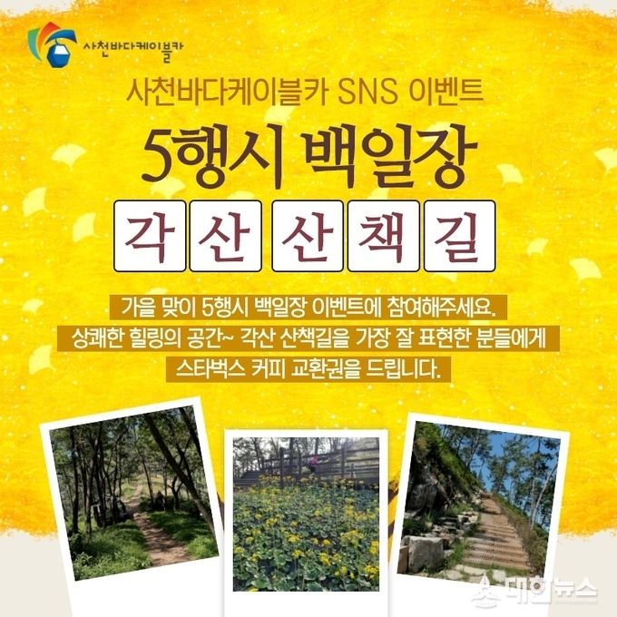 (대한뉴스김기준기자)=사천시시설관리공단(이사장 박태정)은 11월을 맞아 사천바다케이블카를 전국에 널리 알리기 위해 전 국민 누구나 참여 가능한 SNS 이벤트를 진행한다.