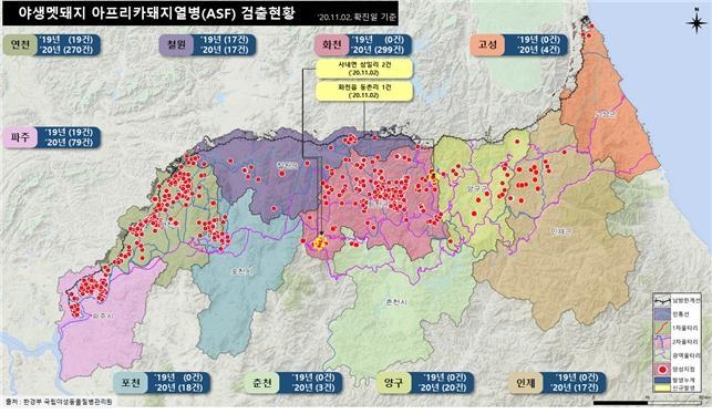 한편, 지난 1주일(10월 29일~11월 1일) 동안에는 야생멧돼지에서 아프리카돼지열병 6건이 추가로 검출되었다. 이로써 2019년 10월 3일 연천 비무장지대에서 첫 발생 이후 현재까지 총 782건이 발생하였다. 이 기간 검사한 시료는 총 120건으로 폐사체 시료 22건과 포획개체 시료 98건이었으며, 양성이 확진된 6건은 모두 폐사체 시료였다.