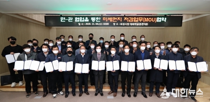 (대한뉴스 한원석 기자)=화성시는 4일 고농도 미세먼지 비상저감조치 발령 시 미세먼지 저감을 위해 관내 44개의 비산먼지 발생 사업장과 ‘민‧관 협업을 통한 미세먼지 저감업무협약(MOU)’을 체결했다.