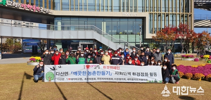 (대한뉴스김기준기자)=고령군(군수 곽용환) 다산면은 11월 3일(화) 다산면 노곡리 들녘 하우스 주변과 제방 및 도로변 환경정화를 실시하였다.