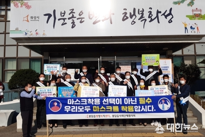 김기용 봉담읍장은 “마스크를 착용하면 감염 위험률을 85%까지 낮출 수 있다”며, “마스크 착용으로 코로나19를 함께 극복할 수 있길 기대한다”고 말했다.