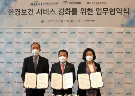 (대한뉴스 한원석 기자)=한국환경산업기술원(원장 유제철)은 환경보건 서비스를 강화하기 위하여 한국직업건강간호협회 및 한국환경보건학회와 11월 17일 서울 중구 LW컨벤션에서 업무협약(MOU)을 체결했다.