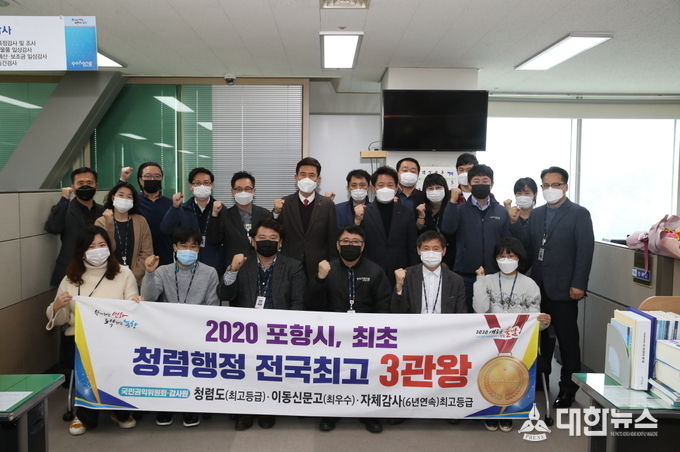 (대한뉴스김기준기자)=포항시는 2020년도 국민권익위원회와 감사원에서 실시한 「청렴도 측정과 이동 신문고 운영평가 및 자체감사활동 평가」에서 최고의 성적으로 청렴행정 3관왕을 달성하여 전국 최고 우수기관의 영예를 안았다.