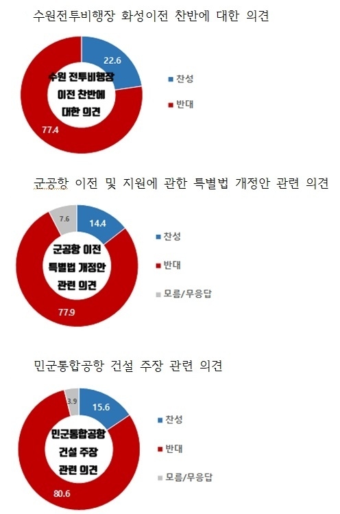 이번 조사는 화성시의 의뢰로 여론조사기관 지식디자인 연구소에 의해 지난 1월 29일부터 2월1일까지 나흘간, 화성시 거주 성인남녀 1,500명을 대상으로 진행됐다. 반대 여론 77.4%는 지난 2019년 11월 15일부터 18일까지 진행했던 조사의 71% 반대 여론보다 상승한 결과다. 그동안 70% 이상을 지속해온 화성시민들의 수원전투비행장 화성 이전 반대 여론은 해를 거듭할수록 더욱 확고해진 것으로 보인다.
