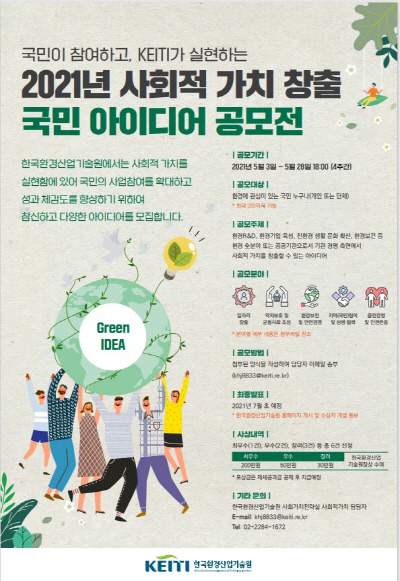 (대한뉴스 한원석 기자)=한국환경산업기술원(원장 유제철)은 국민이 체감하는 사회적 가치를 실현하기 위해 5월 3일부터 5월 28일까지 아이디어 공모전을 진행한다.