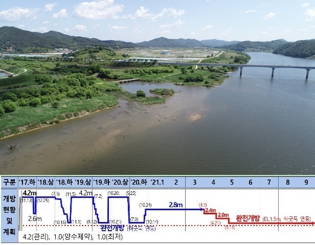 환경부는 농민들의 용수 부족 우려가 없도록, 물 사용이 많은 겨울철 수막재배 시기에는 수문을 닫아 관리수위(EL. 4.2m)를 유지했고, 여름철 물 사용이 상대적으로 적은 시기를 중심으로 개방해왔다. 또한, 지하수 이용에 문제가 확인된 지역에는 대체관정 개발 등 물 이용 대책을 실시했으며, 그 결과 지난해 동절기에 처음으로 예년처럼 백제보 수문을 닫지 않고 부분개방(EL. 2.8m) 상태를 유지했다.