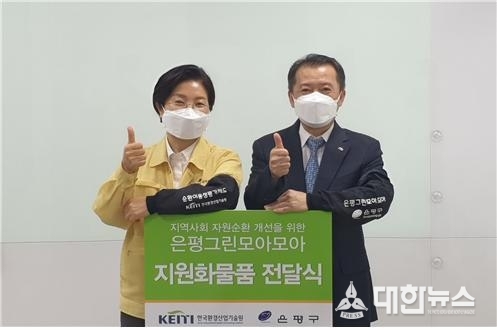 (대한뉴스 한원석 기자)=유제철 한국환경산업기술원장은 순환이용성 평가 활동의 일환으로 5월 14일 서울 은평구청에서 은평그린모아모아(재활용품 분리수거 사업)에 필요한 라벨 제거용 안전칼, 방수 팔토시 등 자원화 물품 1,000여 점을 김미경 구청장에게 전달했다.