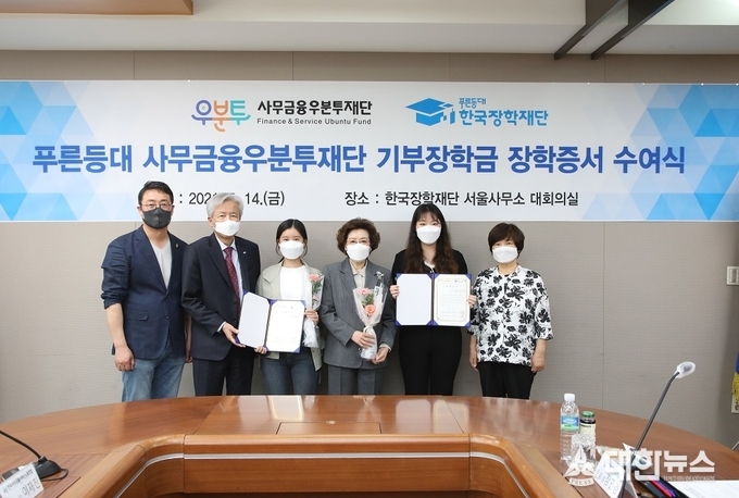 (대한뉴스김기준기자)=한국장학재단(이사장 이정우)과 사무금융우분투재단(이사장 신필균, 이하 “우분투재단”) 및 전국사무금융서비스노조·연맹(위원장 이재진, 이하 “사무금융노조·연맹”)은 5월 14일(금) 한국장학재단 서울사무소 대회의실에서 푸른등대 사무금융우분투재단 기부장학금 장학증서 수여식을 개최하였다.