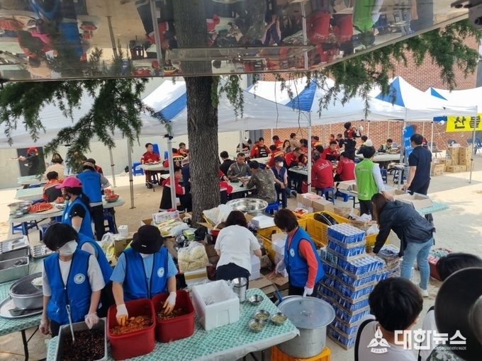 ▲밀양시자원봉사센터와 경상남도자원봉사센터 회원들이 밀양시 부북면의 산불지휘본부에서 IBK기업은행의 후원을 받아 지난 1일부터 5일간 산불진화인력을 위한 사랑의 밥차 봉사에 참여하고 있다.