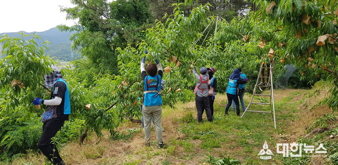 이날 농촌 일손돕기에는 지사 직원 10여명이 참여하여 복숭아 봉지를 씌우고, 곁가지 솎기 등의 농작업을 수행한 후 해당 과수원 일대를 정리하며 해당 농가에 활력을 불어넣었다.