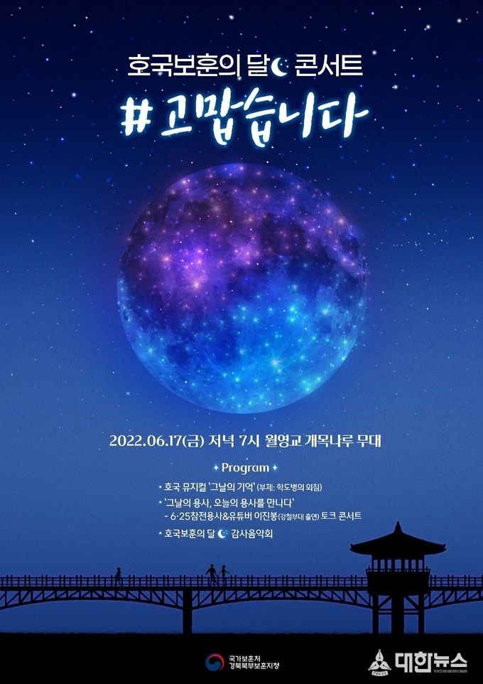(대한뉴스김기준기자)=경북북부보훈지청(지청장 김덕석)은 17일 저녁 7시 안동시 월영교를 배경으로 개목나루 무대에서 호국보훈의 달 콘서트 #고맙습니다를 추진한다.