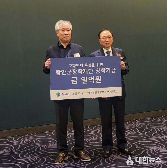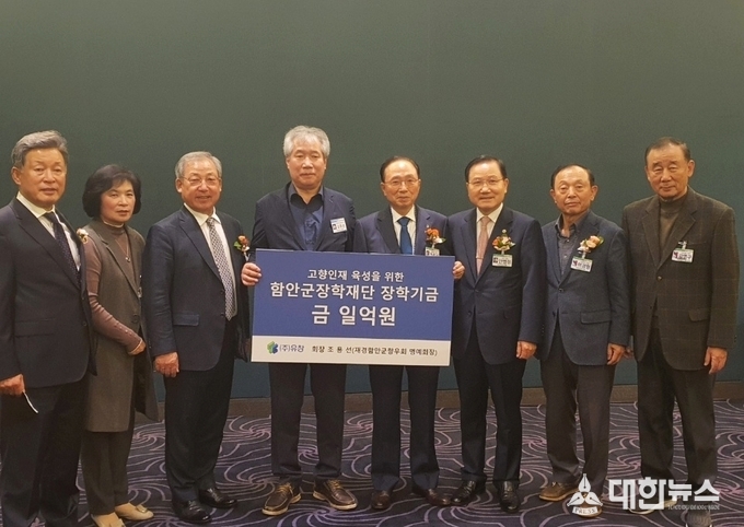 (대한뉴스 김기준기자)=(주)유창 조용선 회장(재경함안군향우회 명예회장)은 지난 2일 재경 함안군 향우회 정기총회 및 향우의 밤 행사에서 고향인재육성을 위한 장학기금 1억 원을 함안군장학재단에 기탁했다.