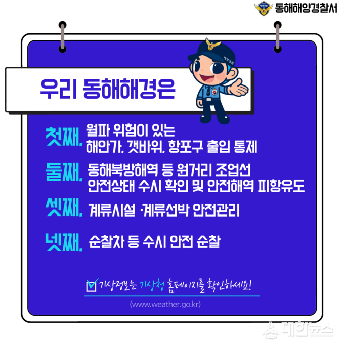 (대한뉴스 김기준기자)=동해해양경찰서는 동해중부 먼바다 풍랑특보에 따라 연안 안전사고 위험성이 있어 그 위험성을 국민에게 미리 알리는 안전사고 위험예보제‘주의보’단계를 8월 29일부터 특보 해제시까지 발령한다고 밝혔다.