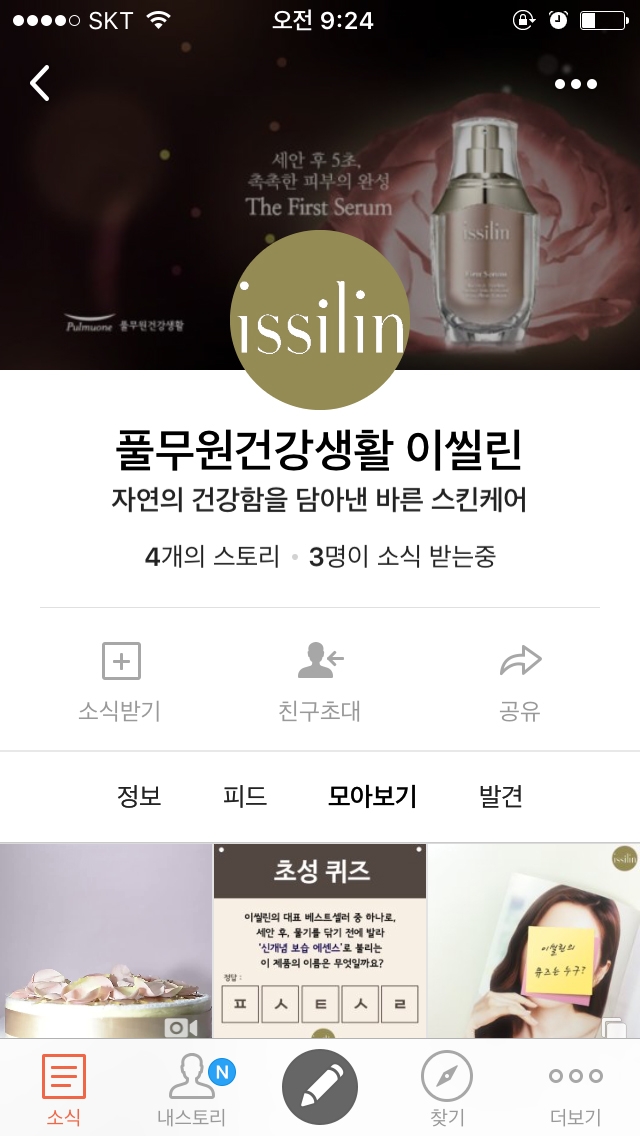 풀무원건강생활의 바른 스킨케어 브랜드 이씰린(대표 여익현)이 고객과 소통하기 위한 채널로 이씰린 카카오스토리를 오픈했다고 1일 밝혔다. 이씰린 공식 카카오스토리는 브랜드, 제품 그리고 올바른 스킨케어 노하우 등을 담을 예정이며, 매주 1회 정기적인 이벤트를 진행해 고객들이 활발히 참여할 수 있는 콘텐츠를 지속적으로 담아 본격적인 고객 소통을 시작할 예정이다.