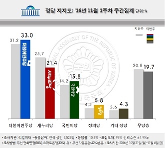 새누리당은 21.4%로 5주 연속 하락, 민주당과의 격차가 11%p 이상 벌어졌다. 새누리당은 대구․경북과 대전․충청․세종, 60대 이상과 30대, 보수층과 진보층을 중심으로 내렸는데, 대구․경북을 제외한 모든 지역에서 민주당과 국민의당에 밀려 2위나 3위에 머물렀고, 선두를 유지한 대구․경북(새 30.1%, 민 25.5%)에서도 오차범위 내에서 쫓기고 있는 것으로 조사됐다.