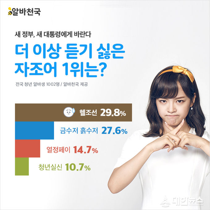 알바천국(대표 최인녕)이 지난5월 22일부터 29일까지 전국 알바생 총1,002명을 대상으로 ‘청년 알바생, 대통령에게 바란다’라는 주제로 설문조사를 실시한 결과, 청년 알바생들이 선택한 ‘문재인 정부에서 더 이상 유행하지 않았으면 하는 자조어’ 1위는 ‘헬조선’, 2위는 이른바 ‘수저 계급론’에서 파생된 금수저, 흙수저인 것으로 나타났다.