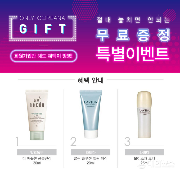 코리아나화장품의 ‘라비다’에서 코리아나 뷰티센터 홈페이지 새 단장을 기념해 회원가입 시 무료 샘플을 증정하는 이벤트를 7월 한 달간 진행한다. 이번 이벤트를 통해 신규 회원가입을 할 경우 발효녹두 더깨끗한 폼클렌징 30ml와 라비다 클린솔루션 필링매직 20ml, 라비다 모이스처 토너 25ml를 받을 수 있는 특별한 혜택을 제공한다.