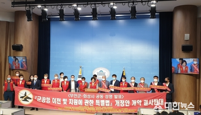 (대한뉴스 한원석 기자)=화성시 국회의원 송옥주(갑), 이원욱(을) 및 전남 무안․영암․신안 국회의원 서삼석과 화성시의회 수원군공항화성이전반대 특별위원회(이하 화성시의회 군공항특위), 무안군의회 광주군공항무안이전반대 특별위원회(이하 무안군의회 군공항특위), 수원전투비행장 화성이전 반대 범시민대책위원회(이하 화성 범대위), 광주전투비행장 무안이전 반대 범군민대책위원회(이하 무안 범대위), 화성시 새마을회‧통리장단협의회‧주민자치회‧경기남부수협어촌계장협의회‧화성환경운동연합 등은 7월 8일 11시 국회 소통관에서 ‘군공항 이전 및 지원에 관한 특별법 개정안(이하 개정안)’철회를 촉구하는 공동 성명서를 발표했다.