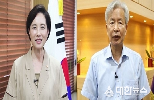 유은혜 부총리 겸 교육부 장관(좌)과 이정우 한국장학재단 이사장(우)이 인문100년 및 예술체육비전 국가우수장학생들에게 영상으로 축사를 전하고 있다.