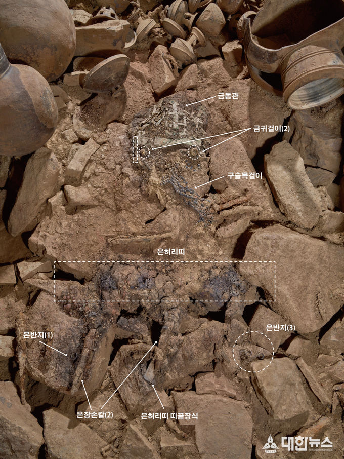 이번에 확인된 장신구 유물은 높이 약 21.5㎝의 금동관과 관에 드리운 금동 드리개 및 금동 막대장식, 굵은고리귀걸이 1쌍, 유리구슬 목걸이, 은반지들과 은 허리띠 등 지배자 몸에 둘렀던 상태의 꾸밈유물 일체로, 신발이 발견되지 않은 것을 제외하면 지난 9월 발굴돼 큰 화제가 되었던 경주 황남동 신라 고분에서 출토된 장신구 일체와 비슷한 구성이다.