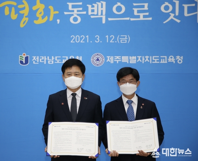 전남교육청과 제주교육청은 12일(금) 오후 여수교육지원청 대회의실에서 업무협약을 맺고 평화·인권교육 활성화를 위해 상호협력하기로 합의했다.