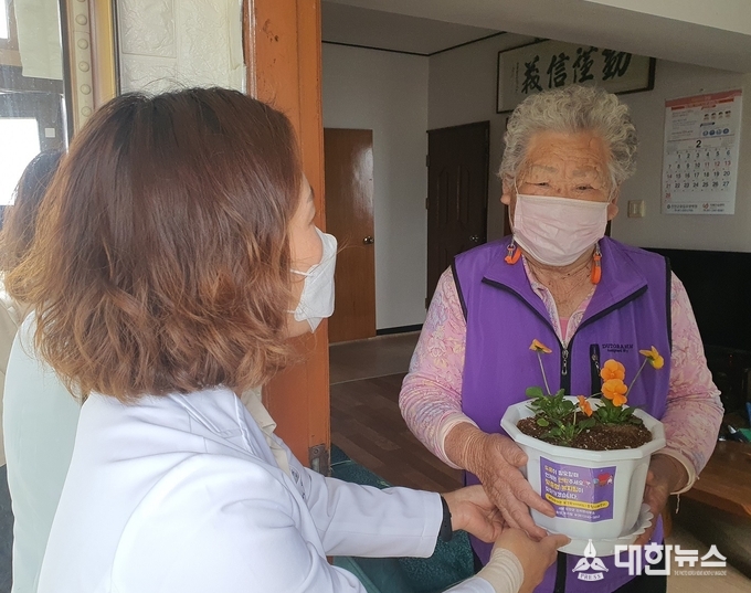 화분을 받은 김정옥(91세)씨는“무릎도 아프고 코로나 때문에 밖에 나가지 못해 답답하고 혼자 지내다 보니 적적했었다”며“텔레비전 옆에 놓여 있는 꽃 화분을 보며 아침에 일어나 잘 잤니?라고 안부인사도 하고 물도 주며 잘 키워보겠다”고 소감을 전했다.